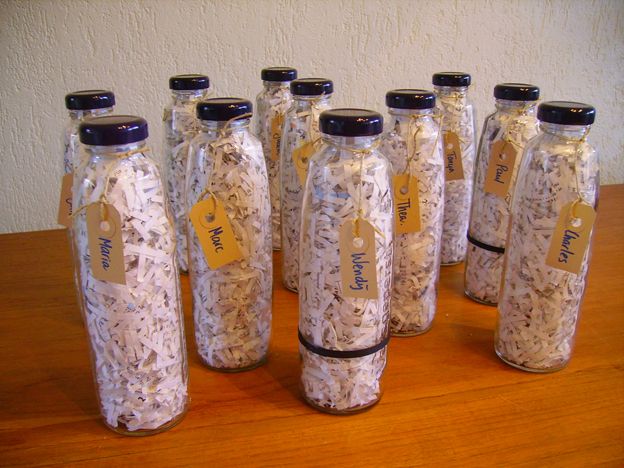 Door het gebruik van dezelfde fles voor elke collega, creëert het werk een eenvormigheid. Dat is een sterk punt. Als je door de papierversnipperaar gaat, dan is dit wat er van over is. Zeer goed over nagedacht.